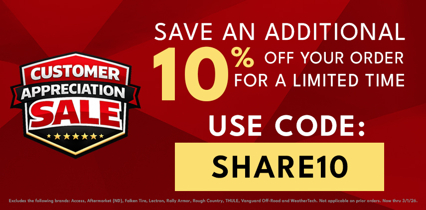 Disclaimer: Excludes the following brands: Access, Aftermarket {ND}, Falken Tire, Lectron, Rally Armor, Rough Country, THULE, and WeatherTech. Not applicable on prior orders.